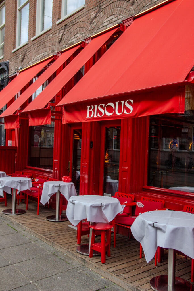 Bisous zit in hartje Amsterdam, midden in de Pijp, tegenover Izakaya. De felrode gevel kun je onmogelijk missen. Zodra je binnenloopt, voelt alles meteen vrolijk en glamourous. Wij namen plaats aan een tafeltje aan het raam. We waren er met de lunch en op de kaart zagen we veel Franse klassiekers staan. Wij lieten de keuken ons verrassen.