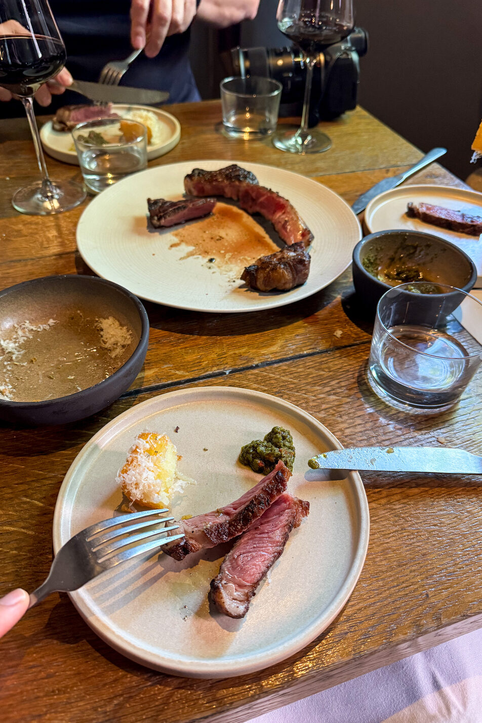 De bloemkool was wat mij betreft het hoogtepunt van de lunch, zó goed. Geroosterd boven open vuur, vol smaak, met dat rokerige randje dat je nog even bijblijft. Grappig, want ook de groenten bij Restaurant Nela sprongen er voor ons uit. Deze chefs weten hoe ze groenten in de spotlight moeten zetten. De maiskip was ook fan-tas-tisch. Mega sappig en perfect gegaard, met een krokante buitenkant en goede grillsmaak. De New York strip was ook heerlijk, lekker mals. Mmm. De chimichurri erbij was top. Het buikspek was ook echt gruwelijk lekker: zacht van binnen, krokant van buiten en vol smaak. Je leest het, we hebben echt goed gegeten.