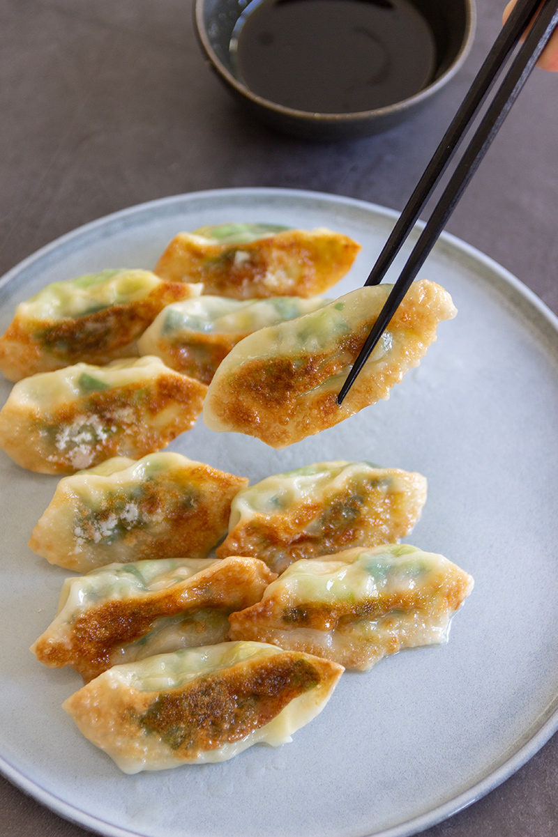 - Leg de gyoza met de gebakken zijde naar boven op een schaal en serveer met de dipsaus.